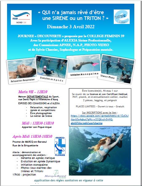 Le collège féminin du CODEP59, vous invite à une JOURNEE « DECOUVERTE » sur le thème de la sirène avec la participation d’ALEXIA Sirène Professionnelle, des Commissions APNEE, N.A.P, PHOTO-VIDEO et de Sylvie Cherrier, Sophrologue et Préparatrice mentale.